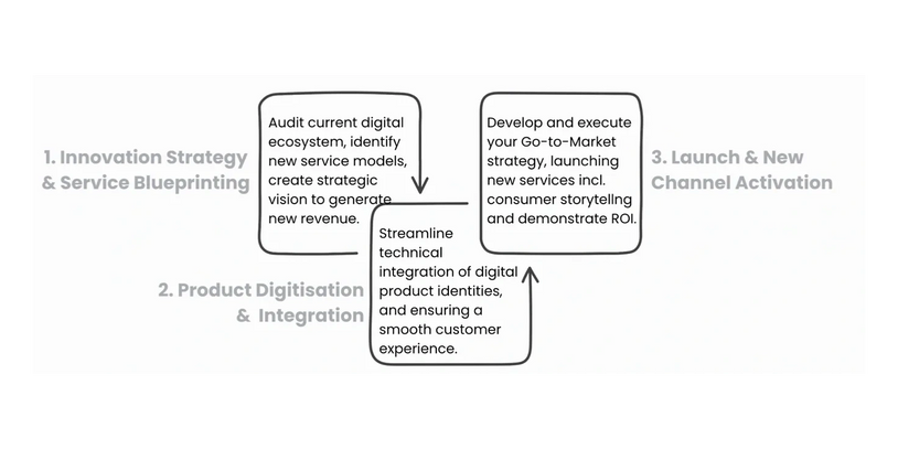 Guide companies to a circular model by implementing product digitisation and leveraging the Digital Product Passport (DPP), as illustrated above. A DPP is a structured collection of data that provides a product's history and other information, all accessible via a unique identifier. This enables new business opportunities after the point of sale, such as after-sales services,